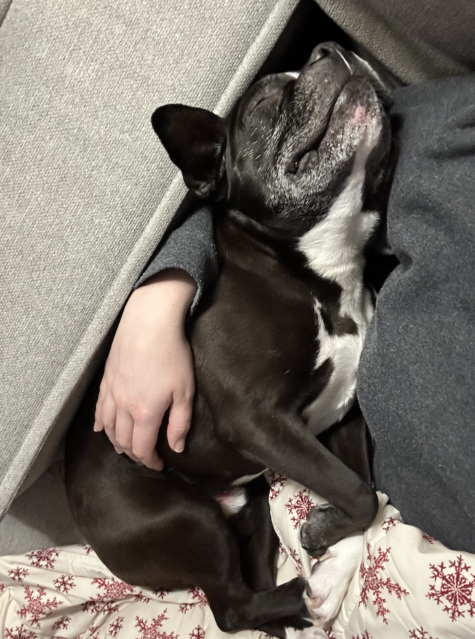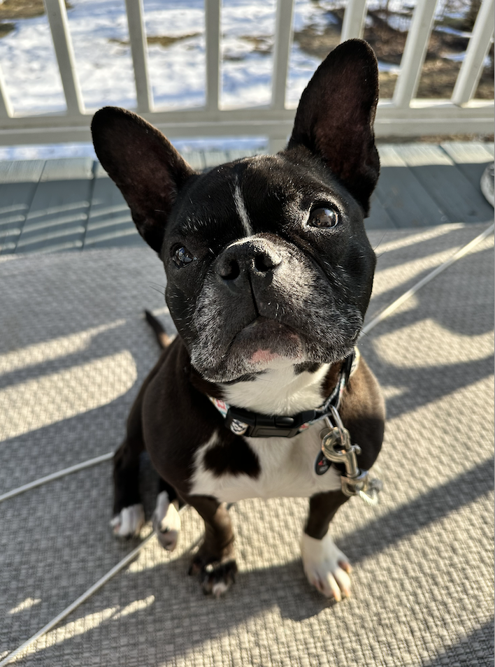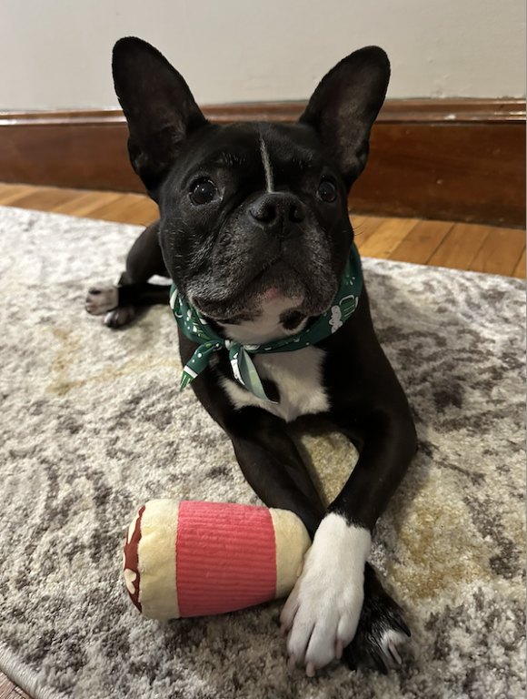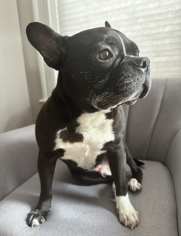 Batman — 6-year-old, 28 lb Frenchie/Boston mix fostered in Boston, MA. Think less caped crusader, more cape-adjacent cuddle crimefighter.