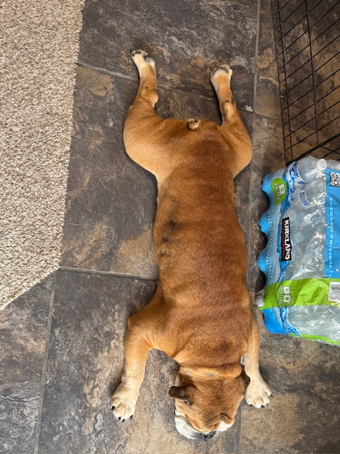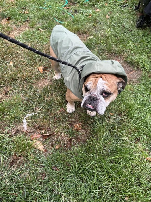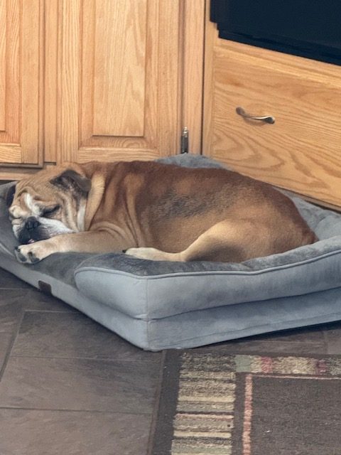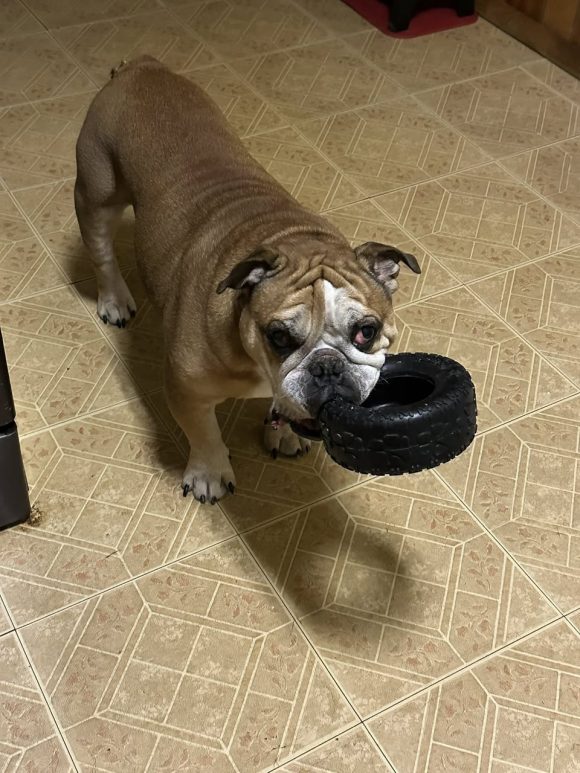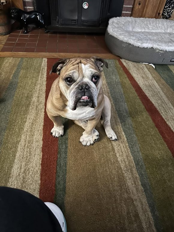 Now, as any true classic will tell you, age (I’m a distinguished 5.5 years young) comes with a few quirks. I’ve got the standard bulldog toolkit: dry eyes (drops help), some mild allergies and hair loss, a sensitive tummy (easily managed), and a noble little limp thanks to my hips (meds keep me comfy). I’m also mostly deaf — I can hear pitched or very loud noises – but don’t let that fool you! With hand signals, I know sit, down, and paw/shake. Pretty impressive, huh?