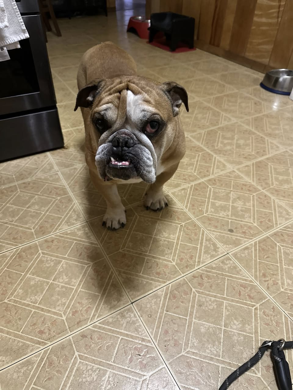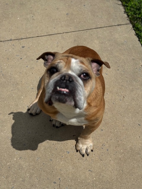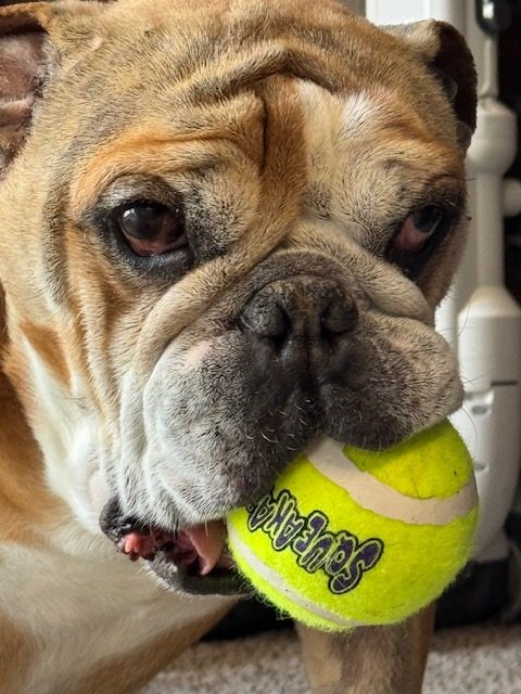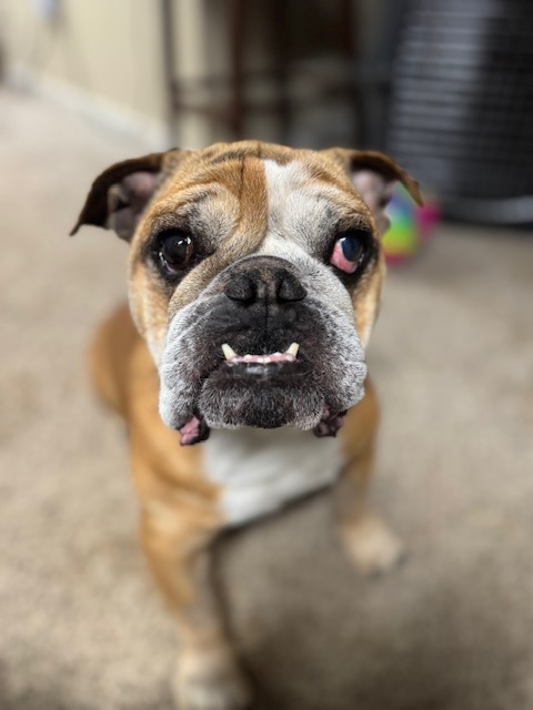 At home, I’m calm and easygoing — a true gentleman. I’m house-trained, use pee pads when needed, and don’t need a crate. Because of my hips, I can’t manage stairs, so a one-level home suits me perfectly. I’d also do best as your one-and-only pet, with no young kids or other animals. I can get a little protective of my toys and food around other dogs, but with people? I’m nothing but heart. I am just a typical crotchety bulldog. I do LOVE to play.