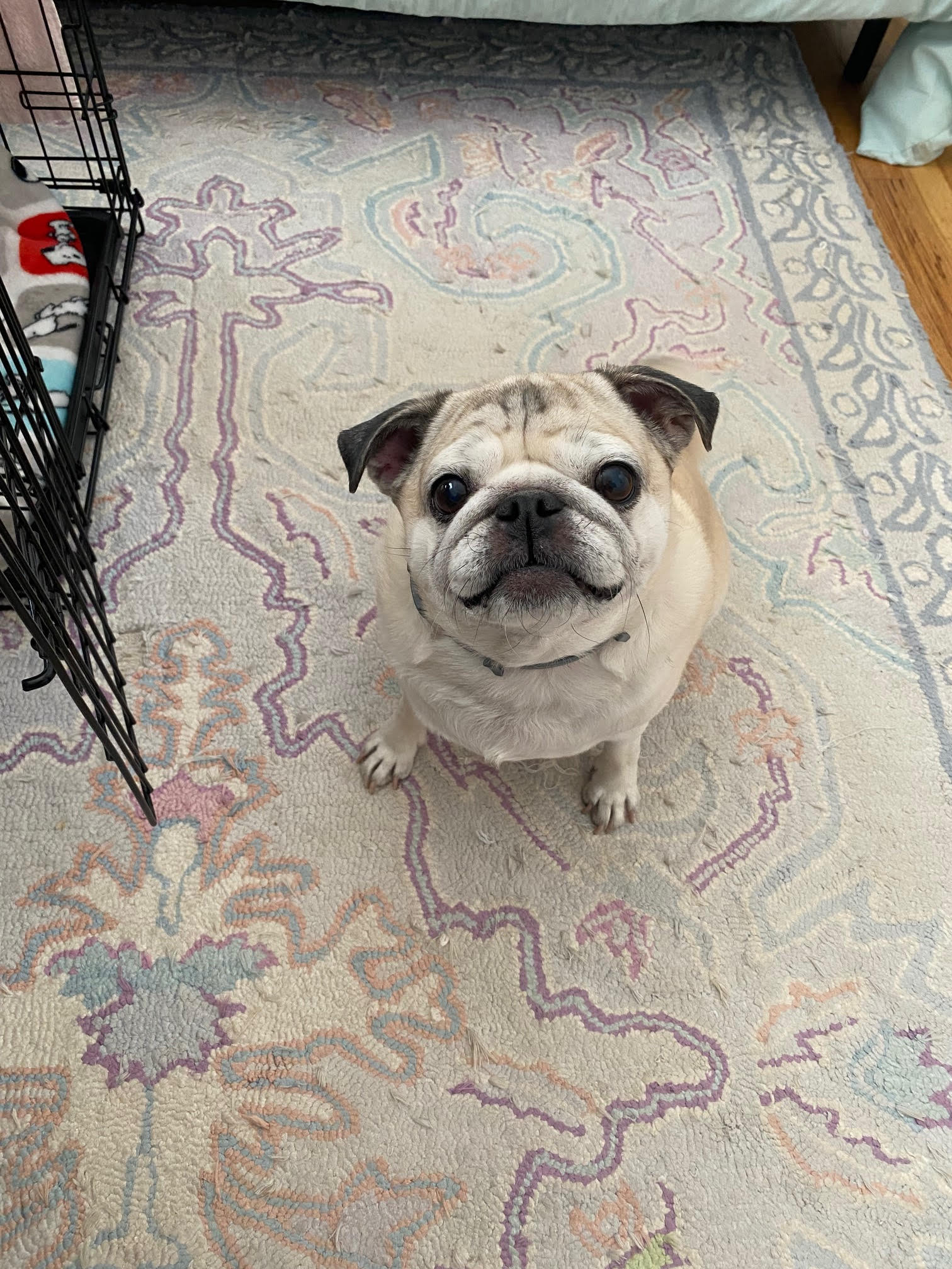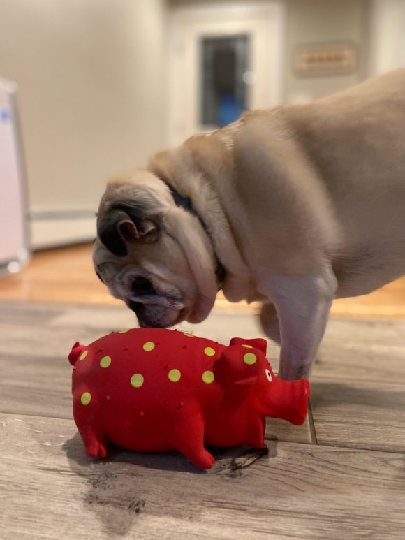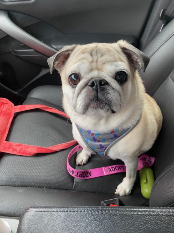 When Pippa first came into rescue, a tiny bump was discovered on her shoulder. It was diagnosed as a mast cell tumor, a word that understandably sounds scary. But here’s the part that matters most: it was low grade (level 2), successfully removed with clean margins, and she is fully healed. No additional treatment is needed at this time. As with any older and wiser gal, she will just need to be monitored. She may be up for some dental care but that will be up to her new best friend. Pippa is feeling fantastic — vibrant enough that people regularly mistake her for a much younger pug.