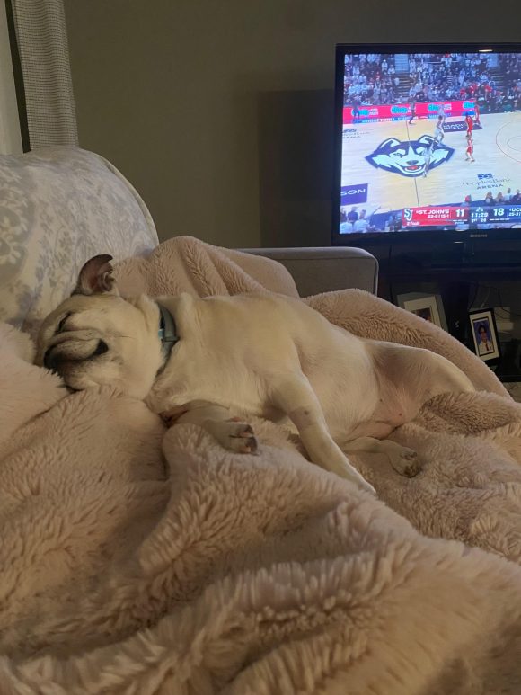 Her joys are simple and endearing: baby carrots hidden in her snuffle mat (she will twirl and “sing” while waiting for them), her Woof Pupsicle treat toy, the occasional stuffed toy, and most importantly — resting beside her person. After a little enrichment and a short walk, she’s happiest curled up on the couch… or even better, sleeping in bed with her human.