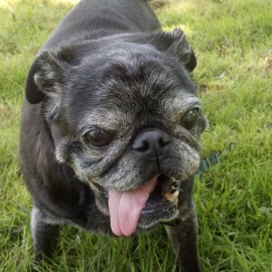 Fergus came to us as a nearly 14 year old special needs pug in the summer of 2016. We fostered him for ten months and then adopted him on my birthday in March of 2017. Though he had many health issues and was fragile, you would never know it. This little man had so much energy, joy and love in his little puggie heart! He was playful and silly and loved a game we called chin grabbing (with only 3 teeth he would gum us and give kisses). He loved our cats and other pug and enjoy a good wander around the local dog park. His trademark smile and shining eyes will forever live in our hearts. He passed away in May of 2017. Rest in peace, sweet one.